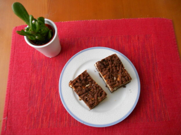 Nejprve si vypracujeme tmavé těsto. Do mísy si dáme všechny suché složky a zamícháme, přidáme změklé máslo, vajíčko a mléko. Vypracujeme těsto, které nakonec na vále zpracujeme, které dáme na plech. Do mísy opět dáme všechny suché složky, přidáme olej, vajíčka a mléko. Těsto je řidší a hezky jej vymícháme metličkou. Připravíme si tvarohovou náplň, kterou rozetřeme na tmavé těsto. Nakonec nalijeme světlé těsto, které rozetřeme po celý ploše plechu. Dáme peci na 180°C asi 40 minut.